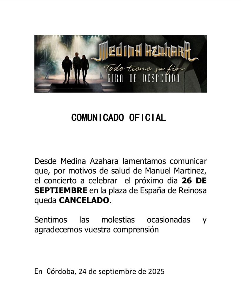 El grupo Medina Azahara se ha visto obligado a cancelar el concierto que tenía previsto ofrecer este próximo viernes, 26 de septiembre, dentro de las Fiestas de San Mateo de Reinosa, por problemas de salud de su cantante Manuel Martínez.